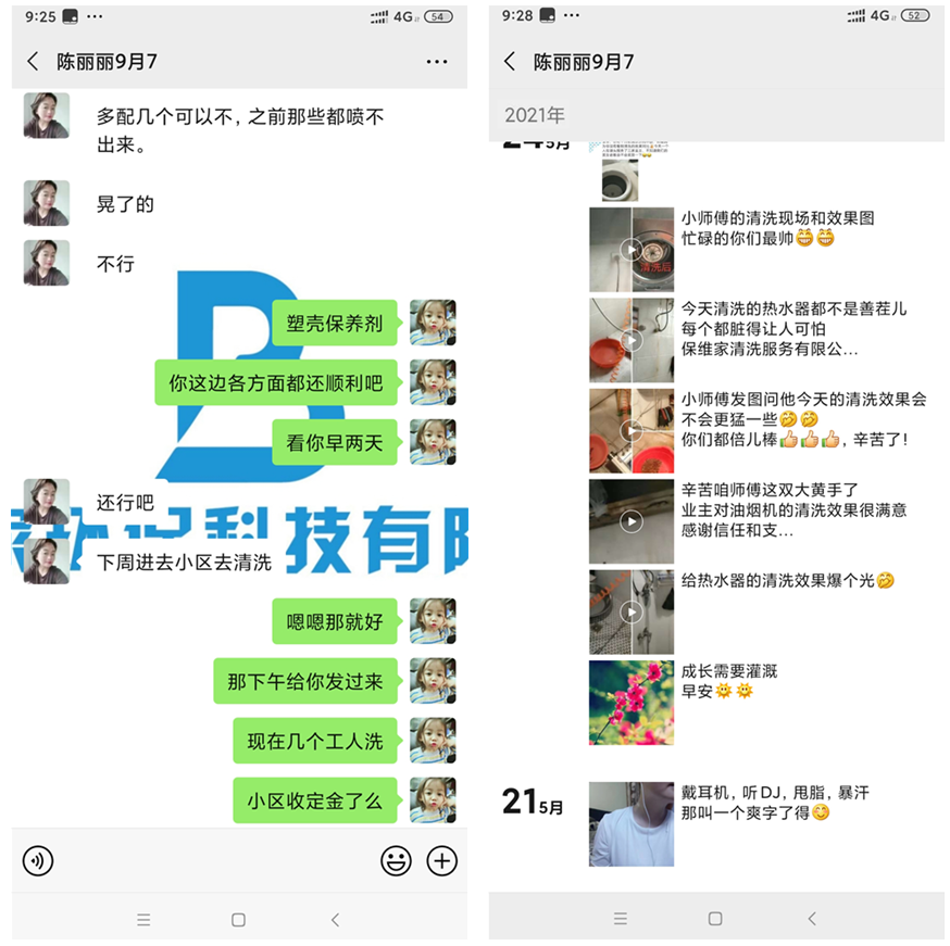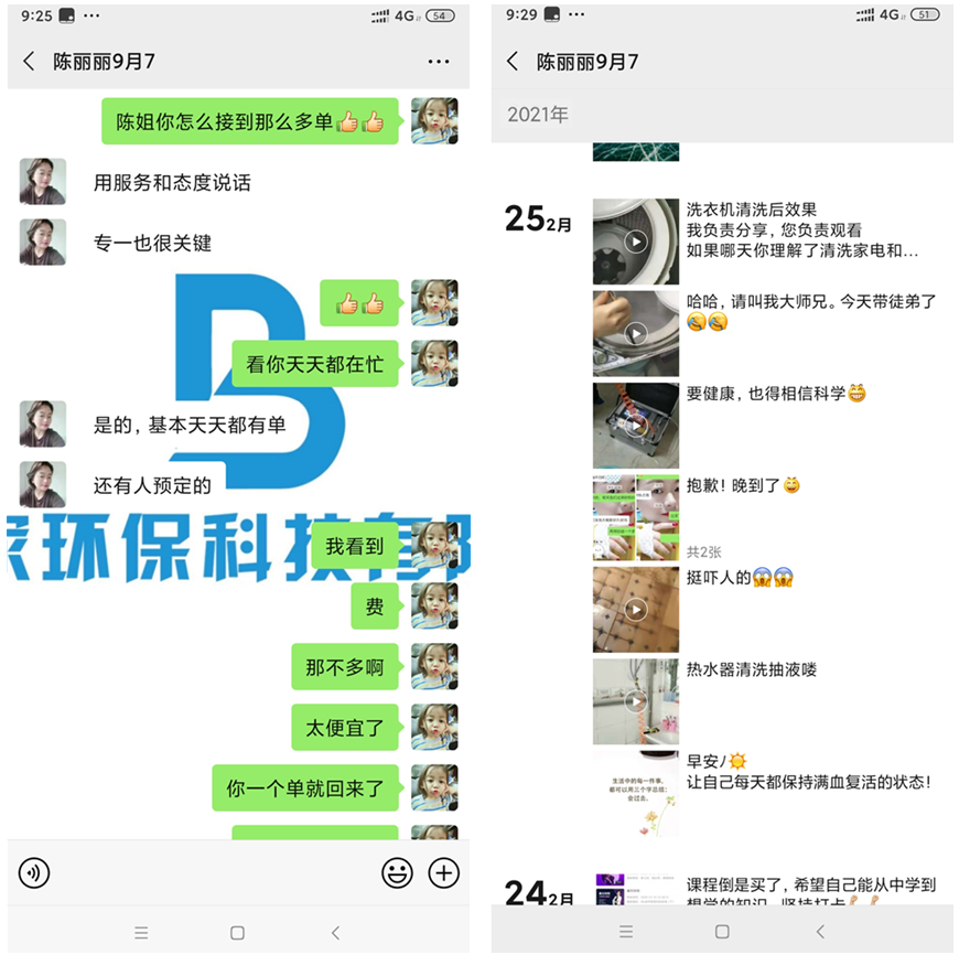 一開始還以為她是免費清洗的,后面她說一家收400。國慶期間麗姐基本天天在清洗,每天都有單子的。商務人員問她怎么那么厲害一下有那么多單,而麗姐表示其實這個項目也并沒有那么難推廣,因為公司的扶持推廣思路很好然后就是自己也肯做肯執行加上把服務做和很多客戶也會轉介紹。