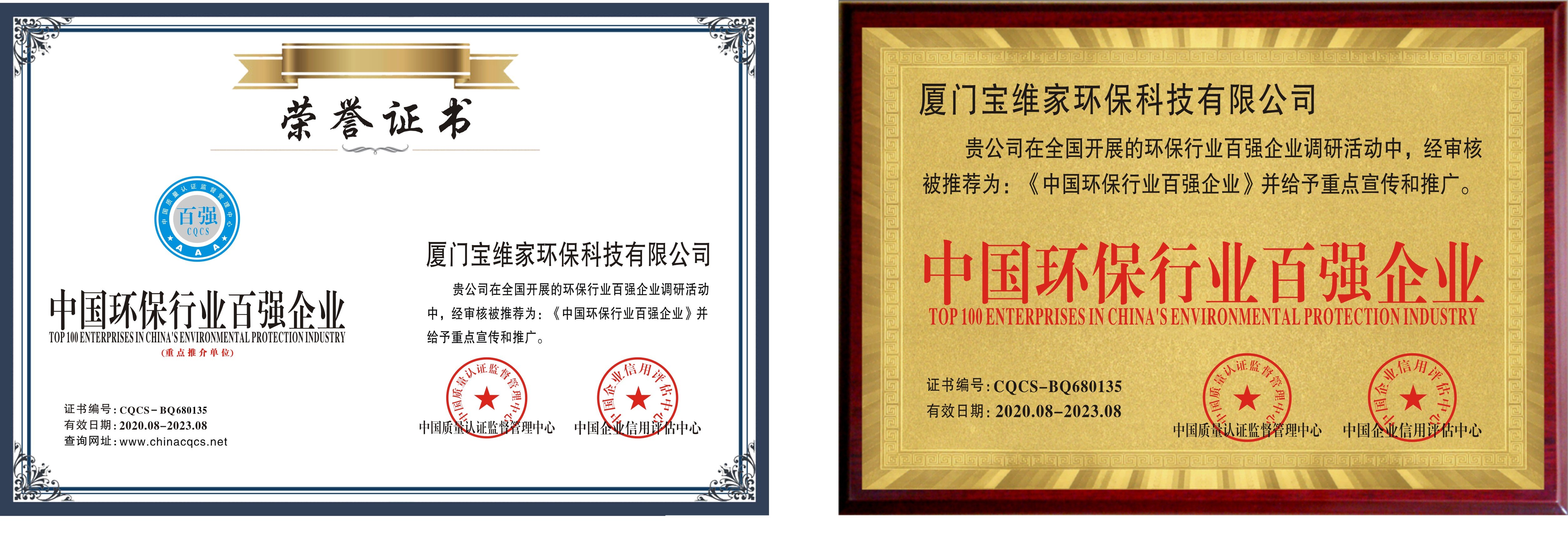 (“中國環保行業百強企業”榮譽證書)