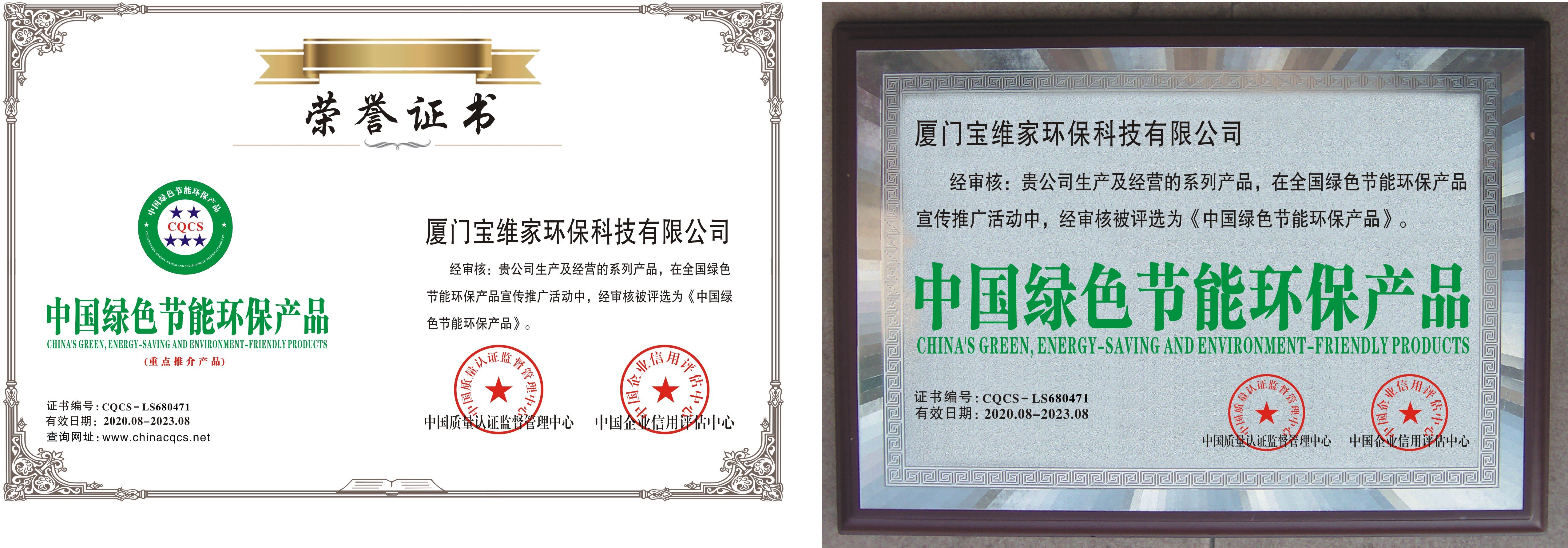 (“中國綠色節能環保產品”榮譽證書)