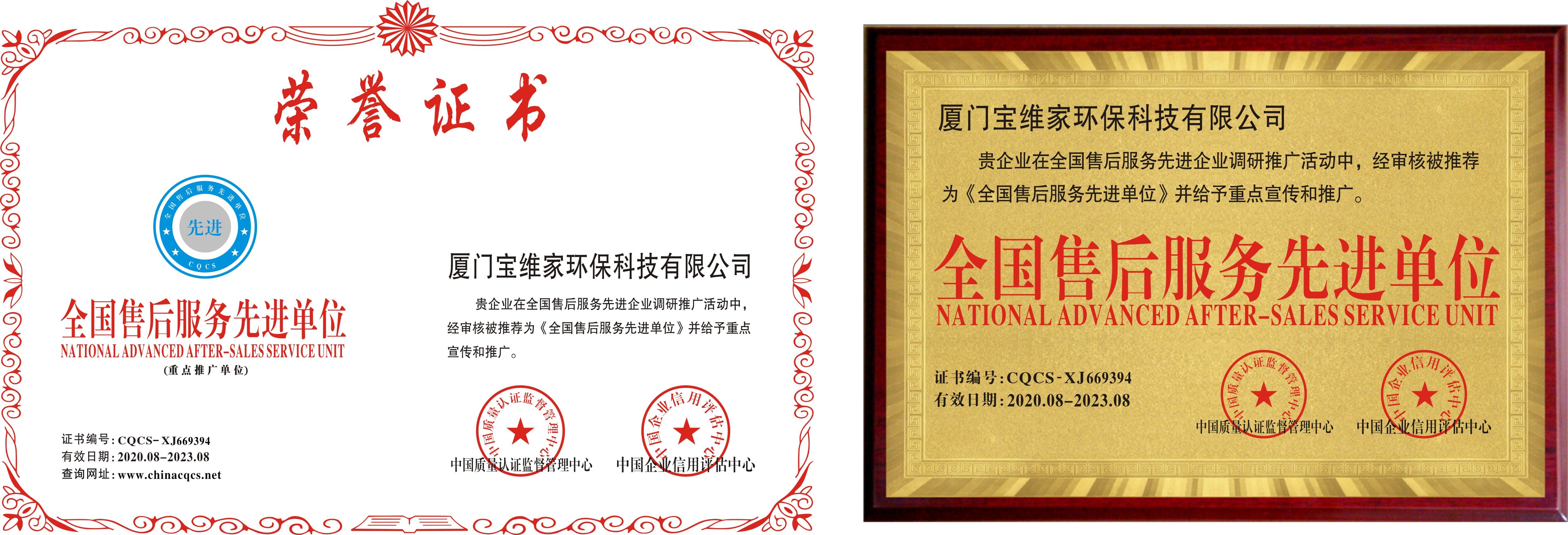 廈門寶維家環保科技有限公司在全國售后服務先進企業調研推廣活動中,經審核被推薦為《全國售后服務先進單位》并給予重點宣傳和推廣。