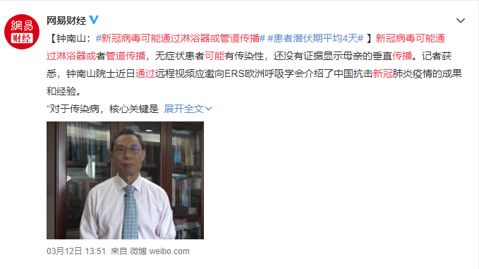 近日,鐘南山院士通過遠(yuǎn)程視頻應(yīng)邀向ERS歐洲呼吸學(xué)會介紹了中國抗疫的成果和經(jīng)驗(yàn)。鐘南山指出:“對于傳染病,核心關(guān)鍵是停止傳播。”無癥狀患者也可能具有傳染性。鐘南山還特別提醒,對于新冠病毒的傳播途徑仍需深入研究,查明是否由于淋浴器或排氣管泄露造成。