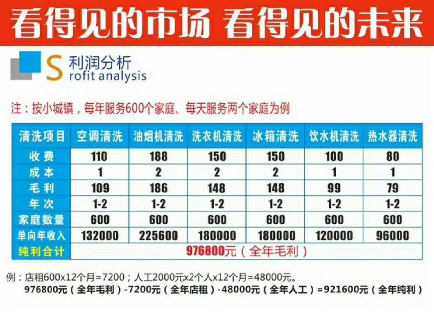 寶維家清洗服務+產品贈送+產品銷售的模式,極易讓客戶養成定期消費我們產品和服務的習慣,迅速在所在城市打開知名度,一個50萬人口的縣城,保守估計5萬個家庭,以20%家庭消費我們全系列的產品以及服務200元計算,縣級城市1年的市場份額為5萬*20%*200=200萬元。無論是客戶需要電器的保養產品或是服務,都潛意識的想到寶維家,家電清洗市場發展潛力巨大。